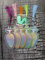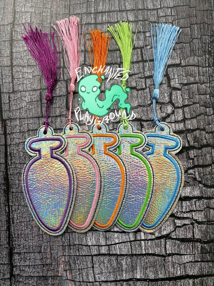 This bookmark is made of faux leather vinyl and polyester embroidery thread. Every bookmark is hand cut. A Tassel is hand applied for a finishing touch.