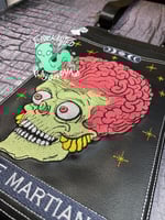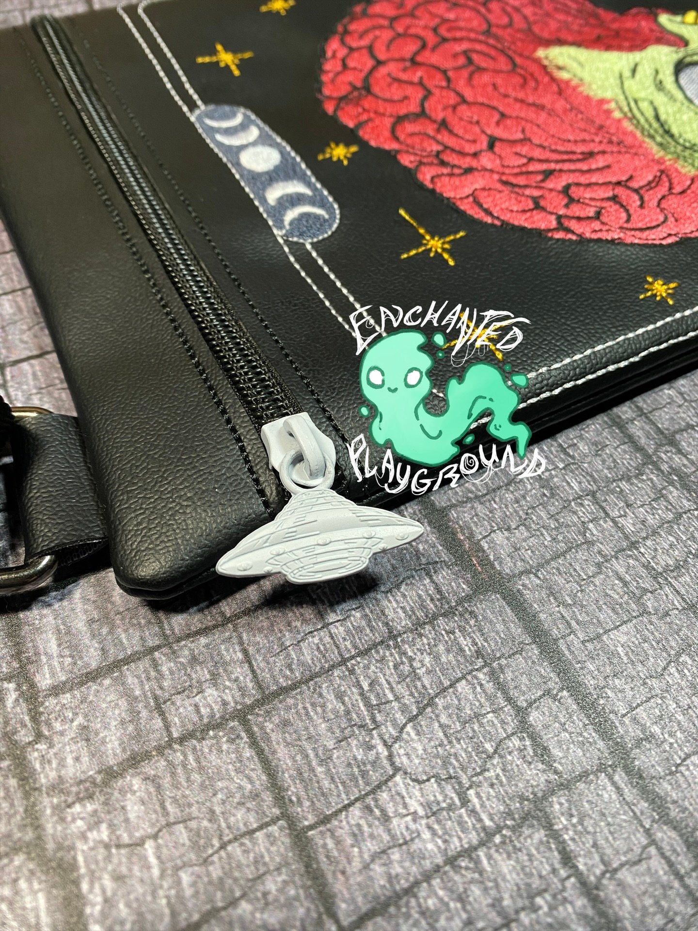The Martian (Attack From Mars) Crossbody bag (Part of the Terror Card Collection) is approximately 7" Wx11" L. Each bag is made by me and I only have a limited number of each zipper pull and kind of zipper. The zipper pull and zipper may differ from the one shown in the picture. If you require specifics, please ask BEFORE ordering.