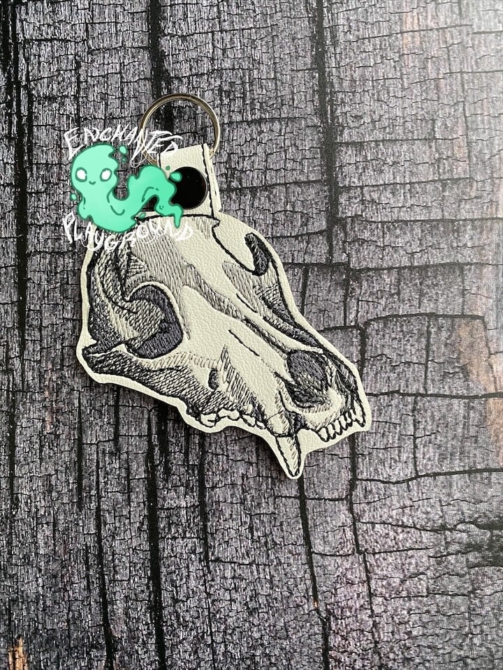 This Canine Skull key fob is made of faux leather vinyl and polyester embroidery thread. Every key fob is hand cut. Snaps are hand applied and the key fob is finished with a silver jump ring to attach to keys, zippers, backpacks, jackets, or just about anything you can hang it from.