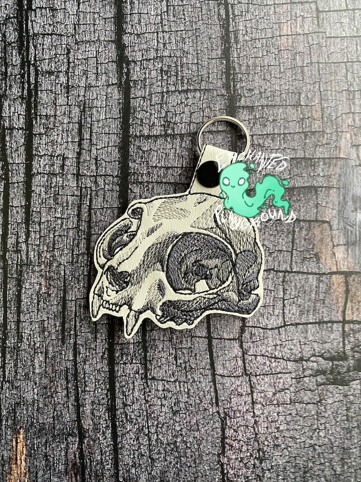 This Cat Skull key fob is made of faux leather vinyl and polyester embroidery thread. Every key fob is hand cut. Snaps are hand applied and the key fob is finished with a silver jump ring to attach to keys, zippers, backpacks, jackets, or just about anything you can hang it from.