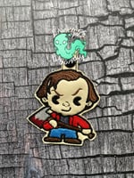 This Chibi Jack Torrance keyfob is made of faux leather vinyl and polyester embroidery thread. Every keyfob is hand cut. Snaps are hand applied and the keyfob is finished with a silver jump ring to attach to keys, zippers, backpacks, jackets, or just about anything you can hang it from.