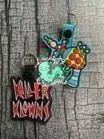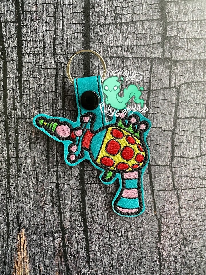This Cotton Candy Gun key fob is made of faux leather vinyl and polyester embroidery thread. Every key fob is hand cut. Snaps are hand applied and the key fob is finished with a silver jump ring to attach to keys, zippers, backpacks, jackets, or just about anything you can hang it from.