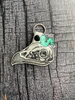 This Raptor Skull key fob is made of faux leather vinyl and polyester embroidery thread. Every key fob is hand cut. Snaps are hand applied and the key fob is finished with a silver jump ring to attach to keys, zippers, backpacks, jackets, or just about anything you can hang it from.