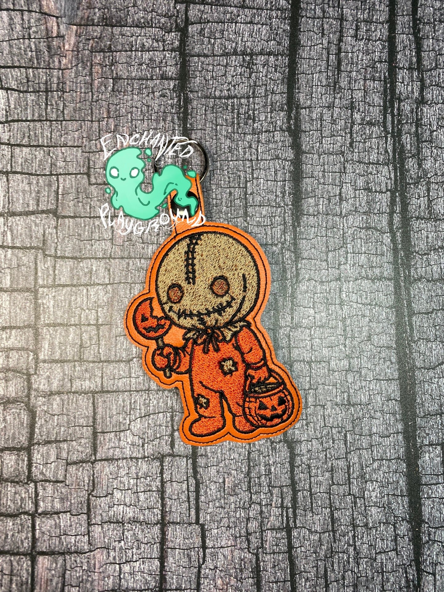 This Sam keyfob is made of faux leather vinyl and polyester embroidery thread. Every keyfob is hand cut. Snaps are hand applied and the keyfob is finished with a silver jump ring to attach to keys, zippers, backpacks, jackets, or just about anything you can hang it from.