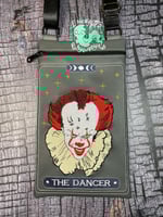 The Dancer (Pennywise - IT) Crossbody bag (Part of the Terror Card Collection) is approximately 7" Wx11" L. Each bag is made by me and I only have a limited number of each zipper pull and kind of zipper. The zipper pull and zipper may differ from the one shown in the picture. If you require specifics, please ask BEFORE ordering.