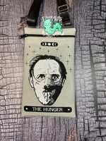 The Hunger (Hannibal - Silence of the Lambs) Crossbody bag (Part of the Terror Card Collection) is approximately 7" Wx11" L. Each bag is made by me and I only have a limited number of each zipper pull and kind of zipper. The zipper pull and zipper may differ from the one shown in the picture. If you require specifics, please ask BEFORE ordering.