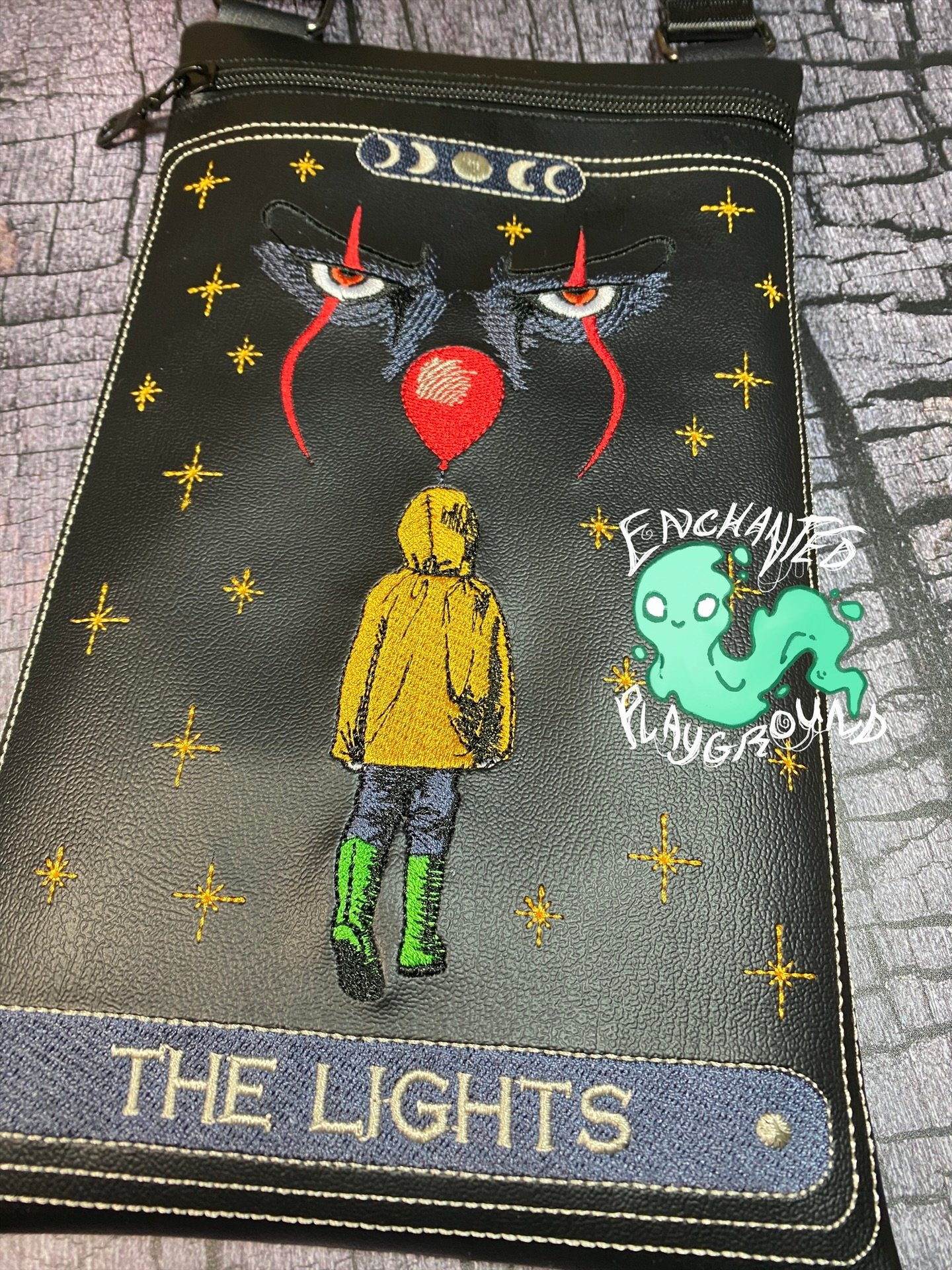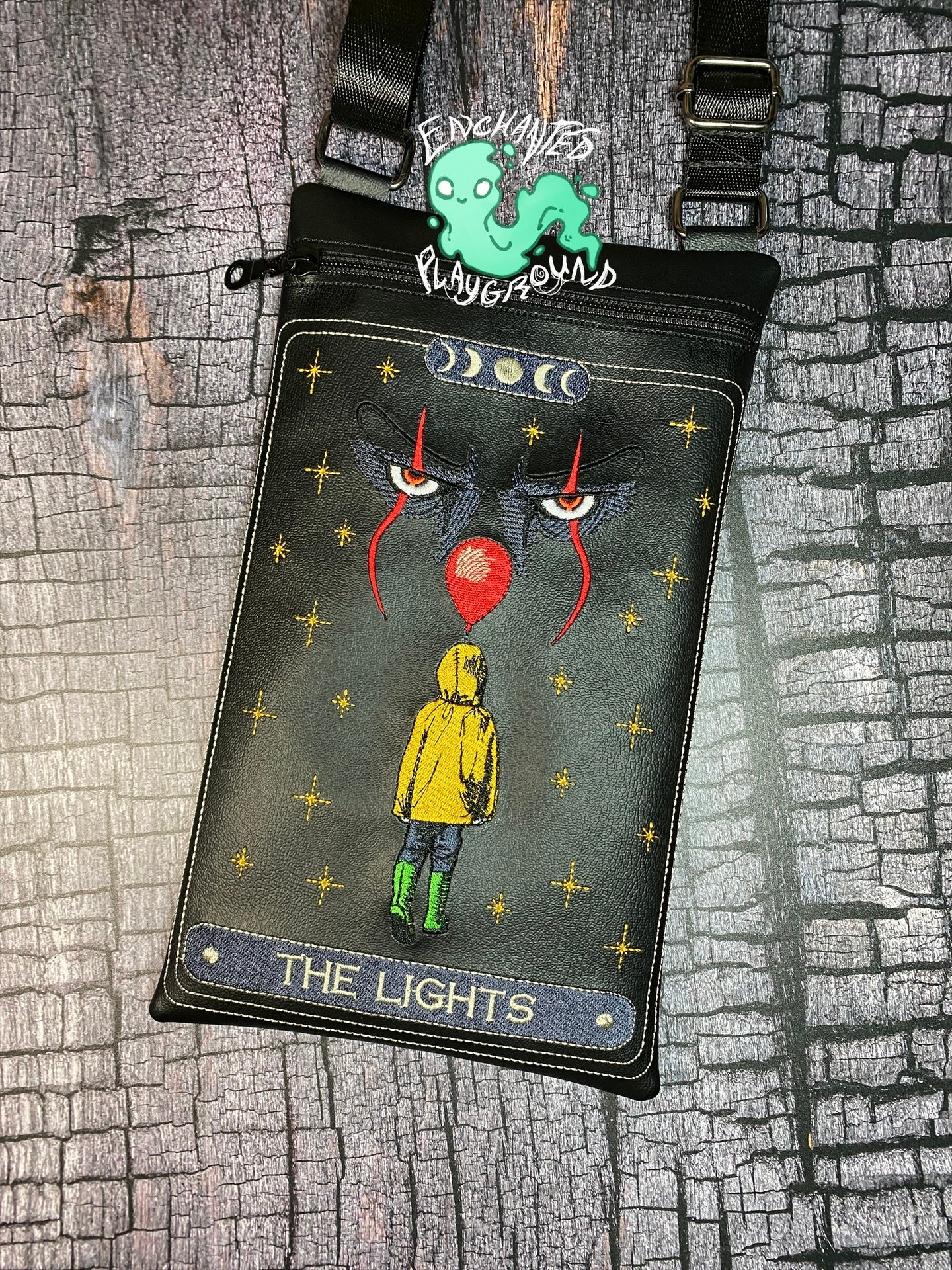 The Lights (IT - Pennywise) Crossbody bag (Part of the Terror Card Collection) is approximately 7" Wx11" L. Each bag is made by me and I only have a limited number of each zipper pull and kind of zipper. The zipper pull and zipper may differ from the one shown in the picture. If you require specifics, please ask BEFORE ordering.